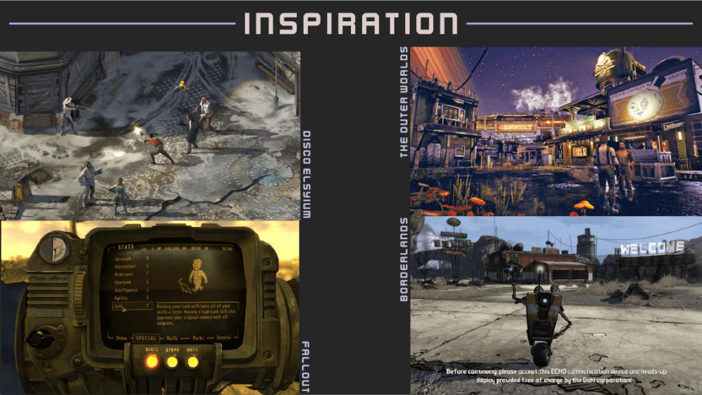 Our main inspirations were games such as Life is Strange, Fallout, Persona 5, and indie titles like Florence and Little Nightmares 2.